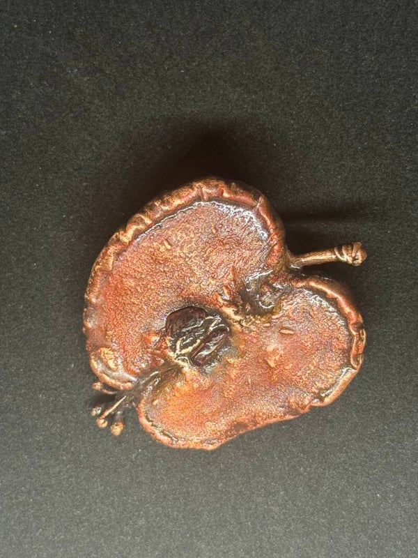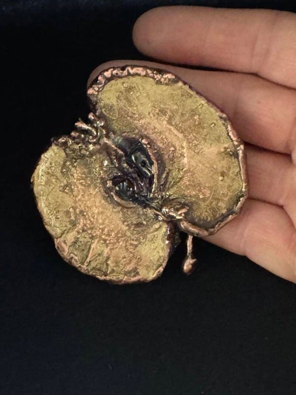 Diese Brosche ist ein echter Dialog zwischen Natur und Kunst. Gefertigt aus einer echten Apfelscheibe und durch galvanische Technik in Kupfer gehüllt, bewahrt sie die organische Struktur und Form der Frucht und verwandelt vegängliche Schönheit in ein dauerhaftes Schmuckstück.